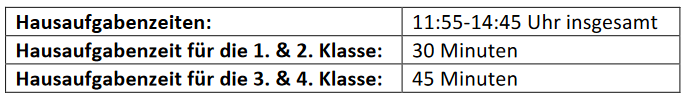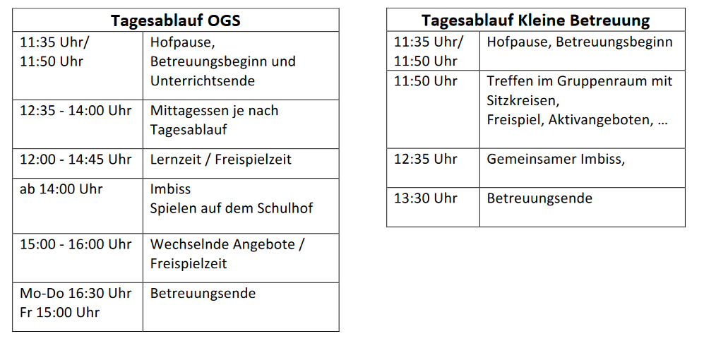 Betreuungszeiten: Montag – Donnerstag 11:40 Uhr bis 16.30 Uhr Freitag 11:40 Uhr bis 15:00 Uhr |