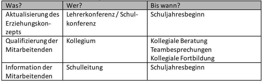 Prozess: Die Überprüfung erfolgt jährlich. Zu Schuljahresbeginn werden die Erfahrungen des vergangenen Schuljahres in der Lehrerkonferenz ausgetauscht, bewertet und eventuell notwendige Konsequenzen formuliert.