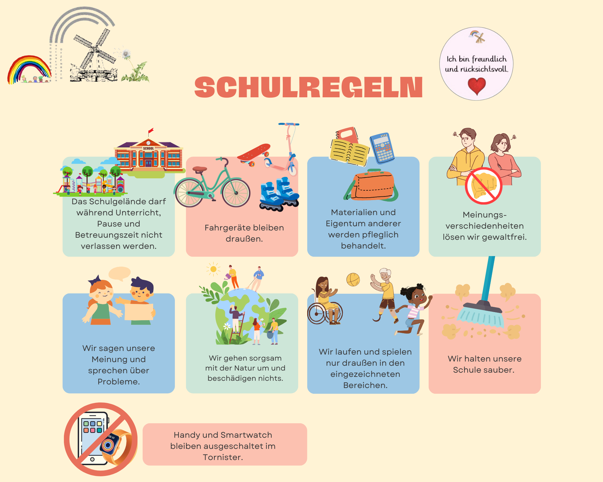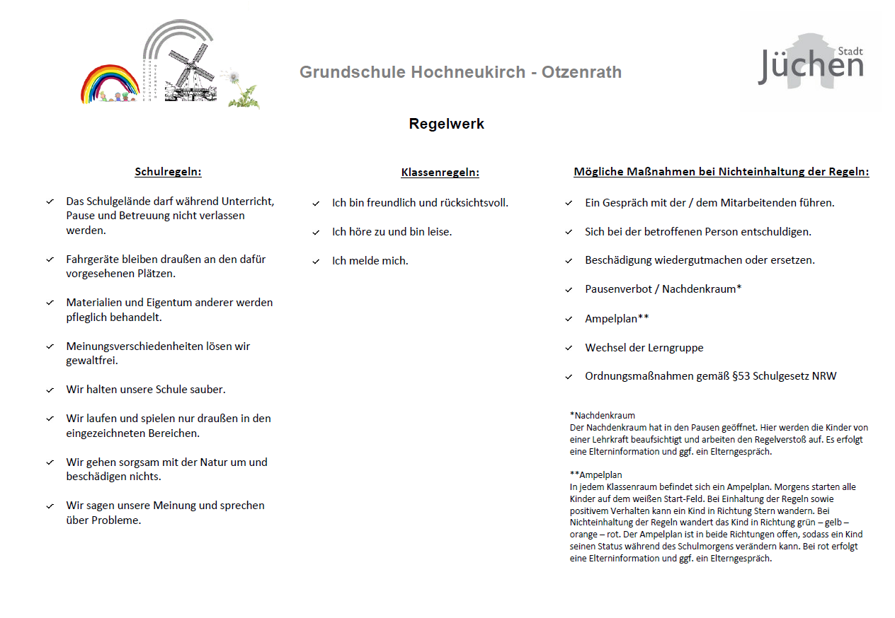 Unser gemeinsam entwickeltes Regelwerk soll helfen, den täglichen Ablauf in Schule und OGS zu organisieren und zu erleichtern. Regeln, die von ALLEN (Schülerinnen und Schülern, Mitarbeiterinnen und Mitarbeitern, Eltern/Erziehungsberechtigten,) akzeptiert sind, geben Sicherheit im alltäglichen Miteinander und bieten einen festen Rahmen, um sich im jetzigen und auch späteren Leben zu orientieren.