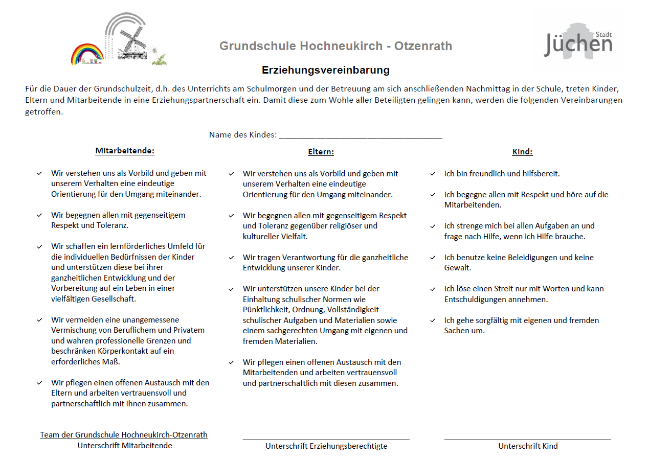 Aus diesem Grund unterschreiben alle Mitglieder unserer Schulgemeinschaft unseren gemeinsam festgelegte Erziehungsvereinbarung zwischen Schule und Eltern (siehe Anhang 6.5.).