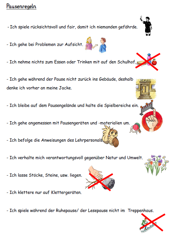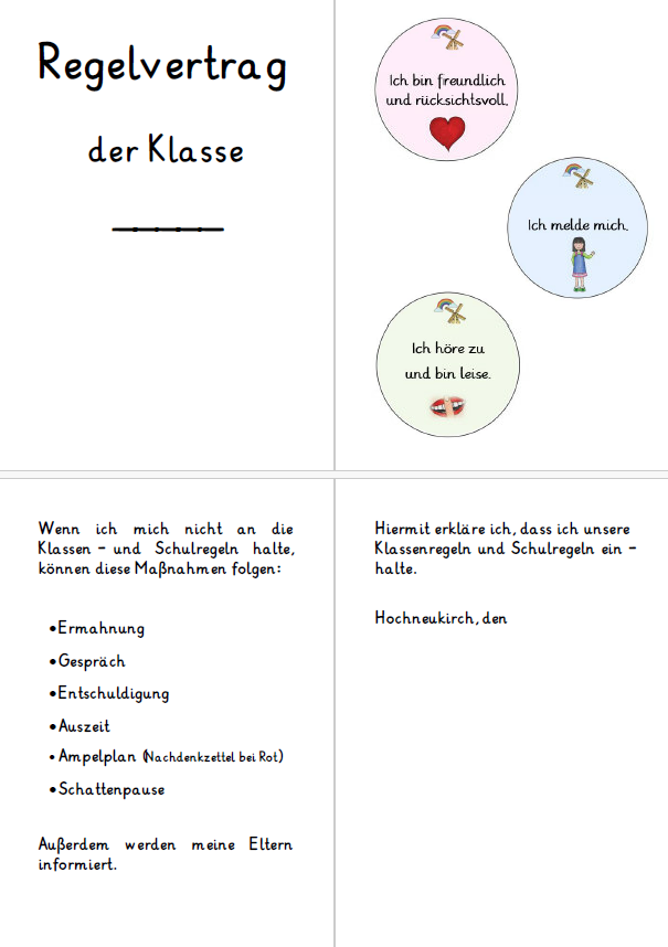 – Klassenregeln (siehe Anhang 6.2 welche in allen Klassen gleich sind, aber im Klassenverband weiter ausdifferenziert werden. Vereinbarungen werden in einem Klasseninternen Regelvertrag aufgeschrieben.)