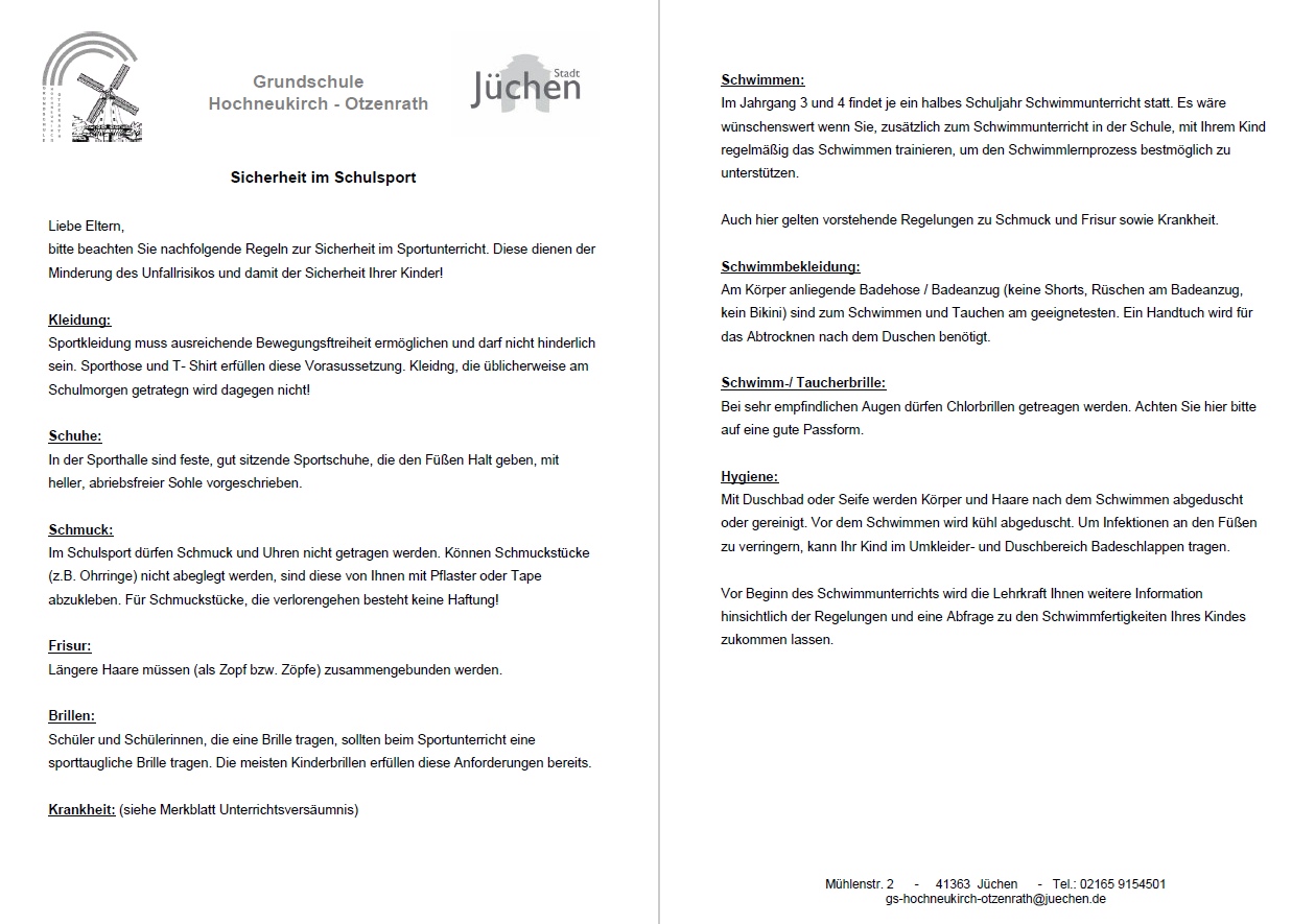 – Sport- und Schwimmbadregeln (siehe Anhang 6.4 „Sicherheit im Schulsport“ welche Eltern bei Schulanmeldung ausgehändigt werden)